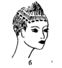 Стрижем челку, отделяя ее дугообразным пробором, и подстригаем волосы боковой зоны, оставляя длину средней между фронтальной и макушечной зонами, (рис. б).