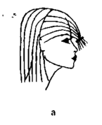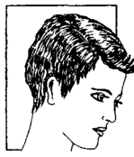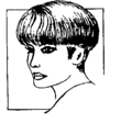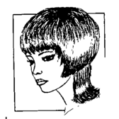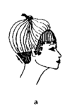 Затем отделяем челку и бачки. Челку стрижем 2-3-я прядями по прямой линии выше бровей. Бачки подстригаем по желанию клиента. Можно оформить короткие треугольные бачки или оставить длинные, сильно прореженные. По кромке волос отделить прядь, обрамляющую лицо, и подстричь (рис. а).