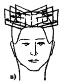 3. Так попрядно вертикальными проборами отчесываем волосы теменной зоны на виски и стрижем их на уровне предыдущих прядей с внешней градуировкой, угол оттяжки 45–90 градусов. Таким образом, продвигаемся одновременно с двух сторон к середине теменной зоны (рис в).
