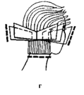 Ориентируясь на длину базовой пряди верхней зоны, стрижем волосы затылочной зоны, забирая их диаметральными прядями вокруг центральной точки головы (рис. в).