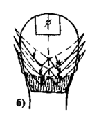 Отделяем прядь вдоль всего горизонтального пробора и стрижем по заданной длине, образуя линию каре. Последующие пряди стрижем методом наложения прядей с небольшим удлинением для естественного подгибания волос вовнутрь. Волосы над лицом стригут в виде бахромы, сильно прореживая (рис. б).