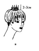 Ориентируясь на длину челки, подстригаем волосы верхней зоны, забирая их горизонтальными прядями (рис. в). Укладку выполняют, поднимая волосы наверх.