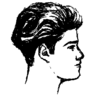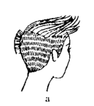 2. Одновременно на височных зонах от линии роста волос над ухом и за ухом также выполняем «сведение на нет» до верхнего овального контура. Окантовка на виске прямая удлиненная (рис а).