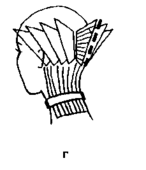 Волосы внизу затылка стричь, забирая их горизонтальными прядями и поднимая вверх, соблюдая соответствующую линию (рис. г).