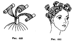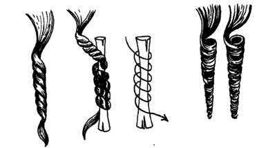 При этом виде завивки половина пряди имеет форму вертикальных локонов, а другая – горизонтальных. Для выполнения завивки влажные волосы расчесывают и делят волосяной покров на зоны. Пряди теменной зоны накручивают на коклюшки обычным горизонтальным способом, начиная накручивание от конца пряди. Затем вдоль краевой линии роста волос выделяют прядь, делят ее на пучки, которые перекручивают в жгуты и накручивают на коклюшку, начиная от корней волос по спирали в направлении к концу пряди. Накрутив половинку пряди и закрепив ее резинкой, накручивают вторую половину пряди на другую коклюшку обычным горизонтальным способом, начиная с конца пряди (рис. 2.23).