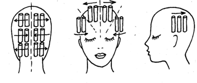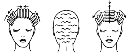 Так, используя две коклюшки на каждую прядь, накручивают все волосы по направлению от краевой линии волос к макушке во всех зонах. Затем завивка выполняется традиционным методом.