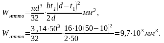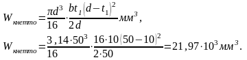 Момент сопротивления изгибу сечения нетто при d=50мм, b=16, t1=10