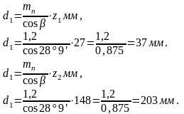 Определили размеры шестерни и колеса: диаметр d1=37мм, d2=203мм; ширина b1=60мм, b2=65мм;