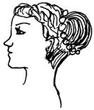 При этой прическе длинные волосы расчесывали на прямой пробор, завивали волнами и довольно низко спускали вдоль щек, а сзади приподнимали и на затылке укладывали в узел, скрепляя шпильками и узкими ленточками.