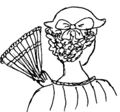 Женская прическа тоже была небольшой и состояла из локонов, поднятых вверх, сколотых на затылке и украшали лентами, пучками перьев, цветами, нитками жемчуга. Волосы обычно пудрились.