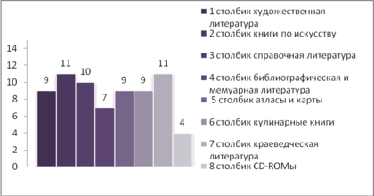 Результаты ответов распределись следующим образом. В 11 (73%) библиотеках из 15 исследуемых по причине «устарелость по содержанию» не исключают книги по искусству (сборники, альбомы репродукции, нотные партитуры и т.п. ) и краеведческую литературу. Книги справочного характера (энциклопедии, словари, справочники) не исключается в 10 (67%) библиотеках из 15. В 9 (60%) библиотеках с осторожностью исключают художественную литературу, атласы и карты, кулинарные книги. Такой вид литературы как библиографическая и мемуарная не исключают по причине «устарелости» в 7 (50%) библиотеках из 15 исследуемых. CD-ROMы не исключаются в 4х (27%) библиотеках. Результаты ответов представлены в гистограмме (рис. 6)