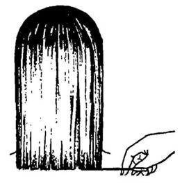 Для цього відокремлюють проділом паралельно лінії росту волосся пасмо на всю ширину потилиці. Товщина пасма залежить від густоти волосся і може бути від 1 до 3 см. Треба ретельно розчесати це пасмо. Вона повинна гладко лежати уздовж спини. Потім зрізати волосся по бажаній лінії. Потрібно постаратися, щоб ця горизонтальна лінія була абсолютно рівною. Для цього зручніше почати стригти із центральної частини відчесаного пасма. Потім рухатися в ту або іншу сторону. Дійшовши до кінця завушної області, перейти на іншу сторону й зрізати волосся по напрямку від краю до центра.
