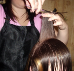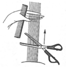 Окантовку волос от виска к челке тоже осуществляют с плавным переходом, полуовалом. Обрамляя верхнюю часть лица. При более длинных волосах линию окантовки можно делать с помощью расчески и ножниц или приемом стрижки на пальцах. Прядь расчесывают до предполагаемой линии окантовки. Расческу к концу пряди слегка разворачивают, чтобы выступающие сквозь зубья волосы прижались к коже головы, и после этого подрезают волосы. Можно также прижимать волосы к коже головы над предполагаемой линией окантовки.