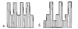 Затем эти прядочки срезают через одну, получая как бы выщип на одном или на разных уровнях (рис. 27 а, б). Такую филировку можно делать на глазок, не соблюдая четкого расстояния между прядками и уровнями их среза (рис. 28).