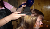 | Рис.43 | Волосы сушатся феном, приподнимая волосы у корней и прорабатывая концы прядей круглой расческой. |