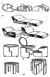Рис.15. Комбінаторні побудови: І – «універсал»: гойдалка-стіл; ІІ –«трансформація» : а – меблі з латексових подушок – крісло, ліжко, шезлонг (дизайнери Дж. Де Пас. Д. Д’урбіно. П. Ломцці) б – батофункціональний контейнер: стіл туалетний – крісло (дизайнер Л. Массон) ; в – штабельовані табурети (дизайнери С. Мигаль, І. Іванів).
