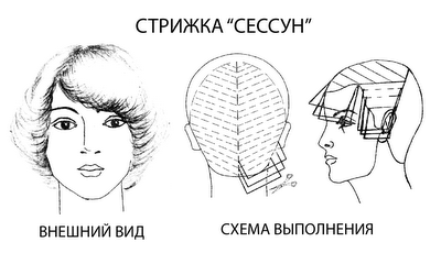 Для стрижки «сессун» характерен процесс укорочения пряди с точностью до 1 мм и оттягиванием волос под различными углами к поверхности головы (от 0 до 45°).
