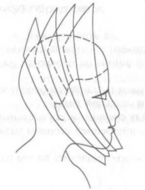 Стрижку выполняют на влажных чистых волосах. Для прямых волос необходима объемная химическая завивка. Волосы делят горизонтальным пробором от уха до уха через высшую точку головы. В затылочной зоне от центра горизонтального пробора до середины затылка проводят вертикальный пробор. От конца этого пробора до середины ушных раковин делают ещё 2 пробора, разделяя затылочную зону пополам, оставшиеся волосы нижней затылочной зоны отчесывают вниз (рис. 1).