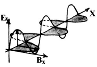 Гармоническая электромагнитная волна (рис.2) – это распространяющееся в пространстве с конечной скоростью гармоническое электромагнитное колебание. Гармоническая электромагнитная волна представляет собой бесконечную синусоидальную волну, в которой все изменения напряженности электрического поля и индукции магнитного поля происходят по закону синуса или косинуса. Причем, колебания вектора напряженности E вектора индукции B в электромагнитной волне происходят перпендикулярно направлению ее распространения. В то же время векторы напряженности и индукции перпендикулярны друг другу. Это означает, что волна движется в направлении, перпендикулярном плоскости, в которой колеблются векторы E и B.