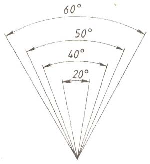 3. Кутові розміри слід наносити так. У зоні, розташованій вище горизонтальної осьової лінії, розмірні числа треба поміщати над розмірними лініями з боку їх опуклості, а в зоні, що знаходиться нижче горизонтальної осьової лінії, – з боку вгнутості розмірних ліній. В заштрихованій зоні наносити розмірні лінії не рекомендується. В цьому разі розмірні числа слід указувати на горизонтально нанесених поличках. Для кутів малих розмірів при нестачі місця розмірні числа потрібно поміщати на поличках ліній-виносок у будь-якій зоні.