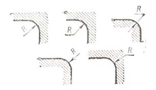 Якщо радіуси скруглень, згинів на всьому кресленні однакові або який-небудь радіус переважає, то замість нанесення розмірів цих радіусів безпосередньо на зображення в технічних вимогах рекомендується робити такі записи, як "Радіуси скруглень 4 мм", "Внутрішні радіуси згинів 10 мм", "Невказані радіуси 8 мм" тощо.