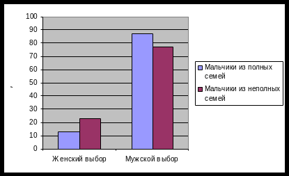 Мальчики, воспитывающиеся в полной семье, главным образом делают мужские выборы, но в их выборах присутствует и доля женских качеств, но меньше, чем у мальчиков из неполных семей.