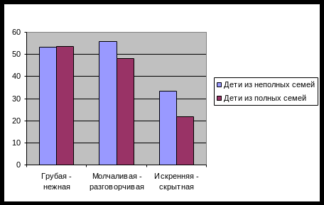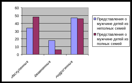 Что касается детей из неполных семей, то они больше выбирают для мужчины качества, присущие женщине, например, терпимость, заботливость, ласковость, чуткость. Количество таких выборов составляет 18%, в то время, как количество таких же выборов у детей из полных семей составляет 6%.