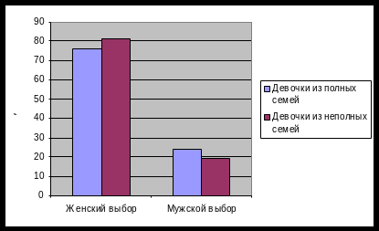 В выборах девочек обеих категорий семей присутствуют не только женские выборы, но и мужские. Заметим, что девочки из полных семей в большей мере склонны к приписыванию себе мужских качеств. Есть вероятность того, что так происходит потому, что в семье они воспитываются и матерью, и отцом. Возможно, девочки выбрали для себя некоторые отцовские качества.