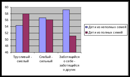 | Младшие школьники из неполных семей | Трусливый – смелый | 54,2 | 54,6 | 54,4 |