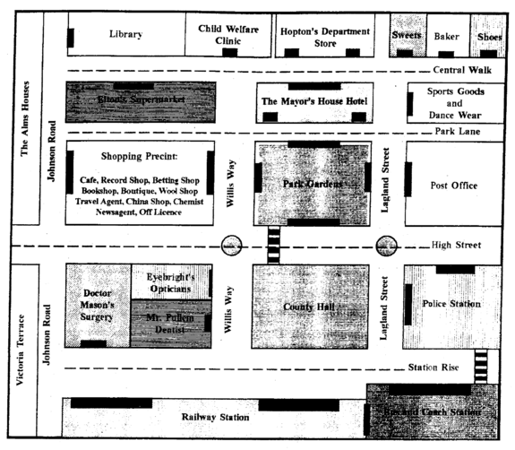 Imagine your friend has only been here for one day. He wants to buy the following items: a loaf of bread, a bottle of wine, some chocolates, a newspaper and some salad items. Using the bus and coach station as a starting point and using the vocabulary in the box, explain how he can buy those items listed using the shortest possible route. Oh, yes, your friend has a problem because his spectacles are broken and he cannot read anything without them. Is there anything he can do? Don't forget to explain where the entrances to the buildings are.