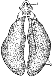 Пищеварительная система лягушки: 1 — пищевод; г —желудок; 3 — тонкий отдел кишечника, 4 — прямая кишка; 5 — мочевой пузырь; 6 — клоака.