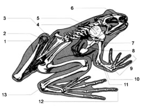 Карточка для проверки знаний1. Рассмотрите рисунок скелета лягушки и обратите внимание на характерные особенности его строения. Запишите названия основных частей скелета в соответствии с их обозначением на рисунке. 2. Почему у лягушки мышцы задних конечностей развиты сильнее, чем мышцы передних? 3. Какие части передней конечности лягушки соответствуют каким частям задней? |