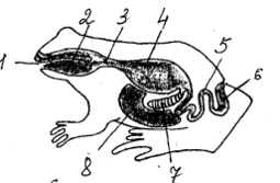 Рассмотрите схему пищеварительной системы лягушки. Выпишите в тетрадь цифры, обозначающие органы пищеварительной системы, и дайте им названия.