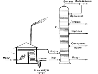 1 – трубчатая печь для нагревания нефти; 2 – ректификационная колонна.