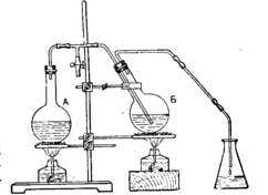 В колбе А нагревают воду – получает пар, а в колбе Б – одновременно нагревает нефть (при отсутствии нефти нагревает заранее приготовленную смесь мазута или машинного масла, керосина и бензина). Собранную в приемнике (вместе с водой) смесь углеводородов разделяет с помощью делительной воронки.