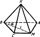 Ставится первое задание. Вызванный ученик выполняет чертеж (рис. 1) и кратко записывает данные: «КАВСМ — пирамида, АВ║СМ, АМ = ВС, АВМ=α, каждая боковая грань составляет с основанием угол φ. Найти Sпол ». Выполняя рисунок, ученик объясняет: «Линейные углы двугранных углов при сторонах основания мы построим по ходу решения задачи, а затем выясним, в какую точку основания проектируется высота пирамиды».