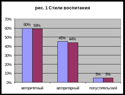 Динамическая двухфакторная модель родительских отношений, предложенная клиническими психологами, основывается на двух шкалах положений: эмоциональной (любовь-ненависть) и поведенческой (автономия-контроль).[11] Однако большая часть современных зарубежных исследований основывается на типологию Д.Борминда[13], выделившего и описавшего три основных стиля родительских отношений: авторитетный, авторитарный и попустительский. Их выраженность наблюдается во взаимосвязанности. В нашем исследовании большую часть (60%) восприятия подростками родительского стиля воспитания составляет всё-таки авторитетный стиль. На втором месте стоит авторитарный (45%) и только 5% составляет попустительский стиль (рис.1).