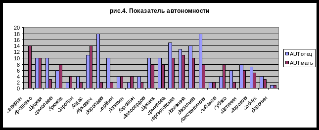 Автономность матери сын видит в директивности и властности, тогда как дочь – в эмоциональной отстранённости и невнимательности к мелочам. В любом случае мать не видит в ребёнке личности при своей автономности и «независимости». В любом случае эмоциональная привязанность и симпатия не могут быть связаны с отстранённостью и директивностью материнского поведения. Отец же в своей автономности видится погружённым в работу и увлечённым футболом, рыбалкой, охотой, друзьями. Подростки сложно переживают как автономность матери, так и автономность отца. Более того, даже при очень хороших отношениях между родителями, автономность их от подросткового мира воспринимается детьми как незаинтересованность и эмоциональная отстранённость. То есть психологическую независимость родителям необходимо очень осторожно проявлять в отношении их детей подростков. Рисунок 4 не отображает детские переживания, но констатирует определённо высокую степень родительской автономности.