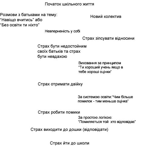 З початком шкільного життя батьки починають розмовляти з дітьми на теми «Як важливо гарно вчитись», «Навіщо вчитись», головною суттю цих розмов є тема «Без освіти ти ніхто». І через невпевненість у собі, з'являється страх бути недостойним своїх батьків та страх бути невдахою. Крім того впливає також поява нових контактів, та через ту ж саму невпевненість у собі дитина боїться зіпсувати відносини з однокласниками, що також сприяє появі страху бути невдахою. Через принцип виховання котрій передається століттями «Ти хороший учень якщо в тебе хороші оцінки» та через драматичне ставлення батьків до поганих оцінок, з'являється страх отримати двійку. А через нашу систему освіти «Чим більше помилок тим менша оцінка» - страх робити помилки. Потім уже малюк на несвідомому рівні робить висновки: «Помиляється той хто відповідає», тому з'являється новий страх – відповідати, виходити до дошки, а потім і страх йти до школи.