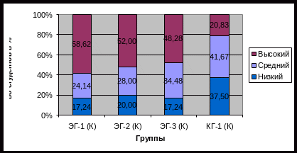 С целью повышения достоверности эксперимента были выделены три экспериментальные группы и одна контрольная группа. В экспериментальной группе «ЭГ-1» проверялась эффективность модели формирования правовой культуры учащихся колледжа в целом, с учетом всего комплекса выделенных нами педагогических условий. В экспериментальной группе «ЭГ-2» - эффективность первого и третьего условия (создание воспитывающей среды на основе проблемного обучения правового характера, целенаправленное включение учащихся в учебную деятельность с применением активных методов обучения, направленных на актуализацию правовых функций). В экспериментальной группе «ЭГ-3» проверялась эффективность введения второго и третьего педагогического условия (формирование ценностно-правовых ориентаций учащихся колледжа путем введения спецкурса, целенаправленное включение учащихся в учебную деятельность с применением активных методов обучения, направленных на актуализацию правовых функций).
