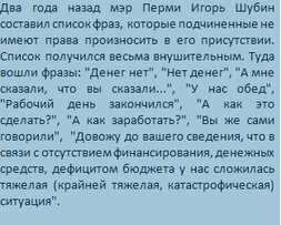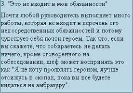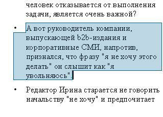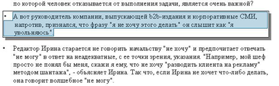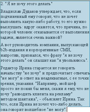 Мои документы – Текст_лаб.doc | Два года назад мэр Перми Игорь Шубин составил список фраз, которые подчиненные не имеют права произносить в его присутствии. Список получился весьма внушительным. Туда вошли фразы: "Денег нет", "Нет денег", "А мне сказали, что вы сказали...", "У нас обед", "Рабочий день закончился", "А как это сделать?", "А как заработать?", "Вы же сами говорили", "Довожу до вашего сведения, что в связи с отсутствием финансирования, денежных средств, дефицитом бюджета у нас сложилась тяжелая (крайней тяжелая, катастрофическая) ситуация". Мы решили узнать, какие же фразы не рекомендуется говорить начальству и коллегам, если вы хотите сохранить с ними хорошие отношения, а о списке, аналогичном пермскому, они не позаботились. 1. "Я не могу" Президент сети кофеен "Кофе Хауз" Владислав Дудаков признался, что не может слышать от подчиненных фразы "Я не могу этого сделать" или "Это невозможно сделать". "Дело в том, что я, если честно, вообще с трудом переношу пессимистов, - объясняет Дудаков. - Если человек пессимистично настроен, мне с ним трудно работать". Руководитель направления "Карьера" портала RB.ru Мария Пикалова тоже не любит эту фразу: "Давным-давно, когда я занималась спортом, мой тренер говорил: "Нет такого слова "не могу", есть слово "не хочу". Так что для меня сказать начальству, что я не могу что-то сделать, это все равно что признаться в том, что не хочу работать, - рассказала Мария. - Если задача трудновыполнима или если я считаю, что выполнять ее нецелесообразно, я, конечно, обязательно об этом честно скажу. Но если партия все равно скажет "Надо!", - буду выполнять приказ". Президент Ассоциации российских банков Гарегин Тосунян рассказал, что если кто-то из его подчиненных говорит, что не может что-либо сделать, значит, так оно и есть. "Мои сотрудники имеют право говорить все что угодно", - заявил он. 2. "Я не хочу этого делать" Владислав Дудаков утверждает, что, если подчиненный ему говорит, что не хочет выполнять какую-либо работу, то его нужно выслушать: вдруг окажется, что причина, по которой человек отказывается от выполнения задачи, является очень важной? А вот руководитель компании, выпускающей b2b-издания и корпоративные СМИ, напротив, признался, что фразу "я не хочу этого делать" он слышит как "я увольняюсь". Редактор Ирина старается не говорить начальству "не хочу" и предпочитает отвечать "не могу" в ответ на неадекватные, с ее точки зрения, указания. "Например, мой шеф просто не понял бы меня, скажи я ему, что не хочу "разводить клиента на рекламу" методом шантажа", - объясняет Ирина. Так что, если Ирина не хочет что-либо делать, она говорит волшебное "не могу". 3. "Это не входит в мои обязанности" Почти любой руководитель выполняет много работы, которая не входит в перечень его непосредственных обязанностей и потому чувствует себя почти героем. Так что, если вы скажете, что собираетесь не делать ничего, кроме оговоренного на собеседовании, шеф может воспринять это как "Я не хочу проявлять героизм, лучше отсижусь в окопах, пока вы все будете кидаться на амбразуру". 4. "Мой рабочий день уже закончился" Непосредственный начальник маркетолога Ольги каждый день закрывает двери своего кабинета ровно в 19:00 и он спокойно воспринимает эту фразу. Предыдущий шеф Ольги считал, что задание должно быть выполнено в срок и что окончание рабочего дня не является серьезным