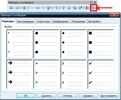 | 2. на панели инструментов выберите пункт «Маркеры и нумерация». Выберите нужный стиль списка. С помощью меню «Настройка» и «Изображение» можно создать свой стиль списка | ||