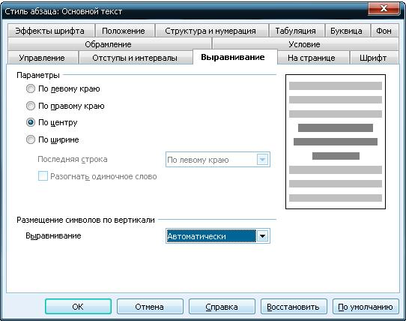 | 2. В меню «Редактировать стиль абзаца» выбрать пункт «Выравнивание» и установить маркер в положение «по центру» | ||