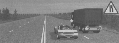 Ответ: Поскольку впереди сужение дороги, о чем предупреждает знак «Сужение дороги», водителю грузового автомобиля придется перестроиться на соседнюю полосу, а при перестроении он должен уступить дорогу легковому автомобилю, движущемуся попутно без изменения направления движения.