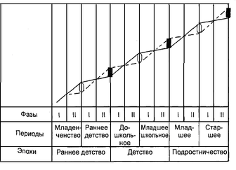 Возрастная периодизация зародилась в античной Греции. В различных отраслях науки о человеке существуют разнообразные, взаимодополняющие друг друга возрастные периодизации. В педиатрии различают два этапа и шесть периодов развития ребенка с момента зачатия до 18 лет, в педагогике принято семь периодов созревания, в психологии выделяют пять периодов развития ребенка4.