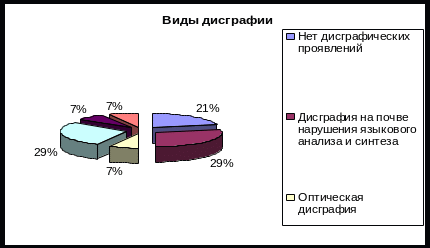 У пятерых детей (36%) встречаются чистые виды дисграфии. Это дисграфия на почве нарушения языкового анализа и синтеза (29%) и оптическая дисграфия (7%).