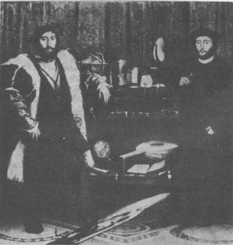 Зажмурив один глаз и наклоняя страницу с репродукцией картины от себя так, чтобы левый нижний угол ее был направлен в открытый глаз и находился на расстоянии около 15 см, можно увидеть у ног послов череп.