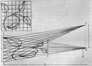 Геометрический метод построения косых изображений состоит в том, что сначала картину расчерчивают на квадратные клетки, затем матрицу растягивают, превращая ее в трапецию, после чего художник копирует картину, заполняя трапециевидные клетки и тщательно следя за возможно более точным соответствием содержимого каждой растянутой клетки содержимому квадратного оригинала.