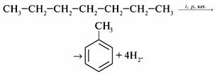 Для получения ароматических соединений используют процесс каталитического риформинга. Алканы нефтяных фракций при температуре 500 °С и повышенном давлении в присутствии катализатора образуют арены и водород: