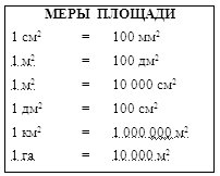На следующем этапе аналогично рассматривается квадратный метр. Обращается особое внимание на решение практических задач (Приложение № 3). Должна быть составлена и усвоена таблица всех изученных единиц площади и их отношений.